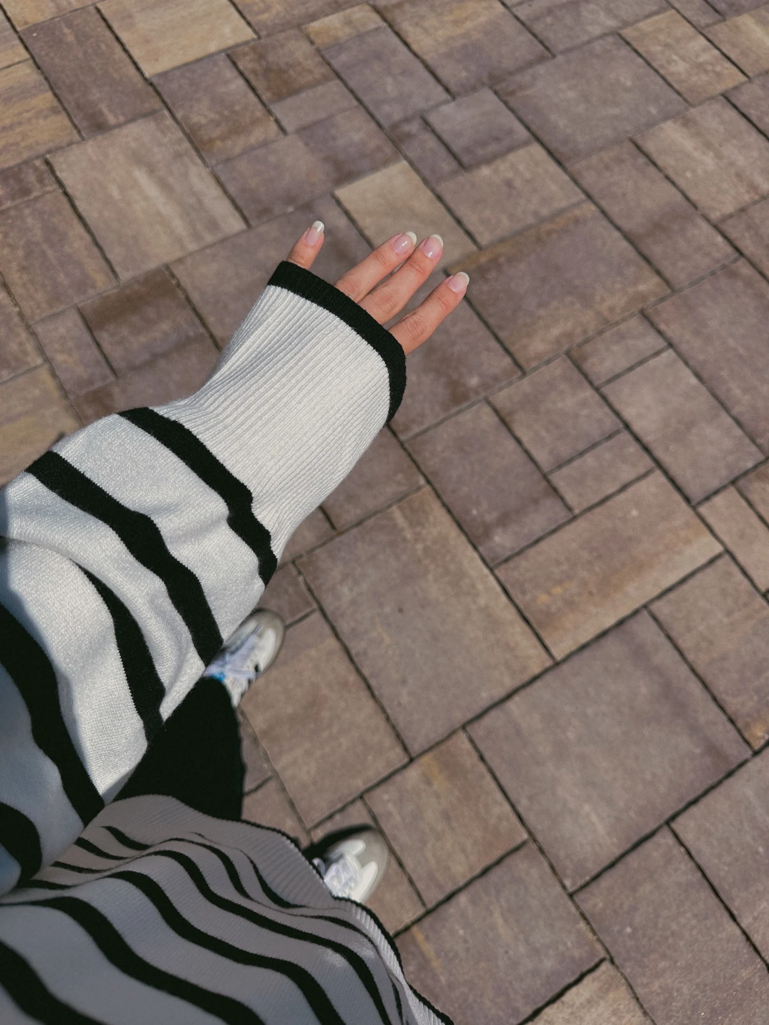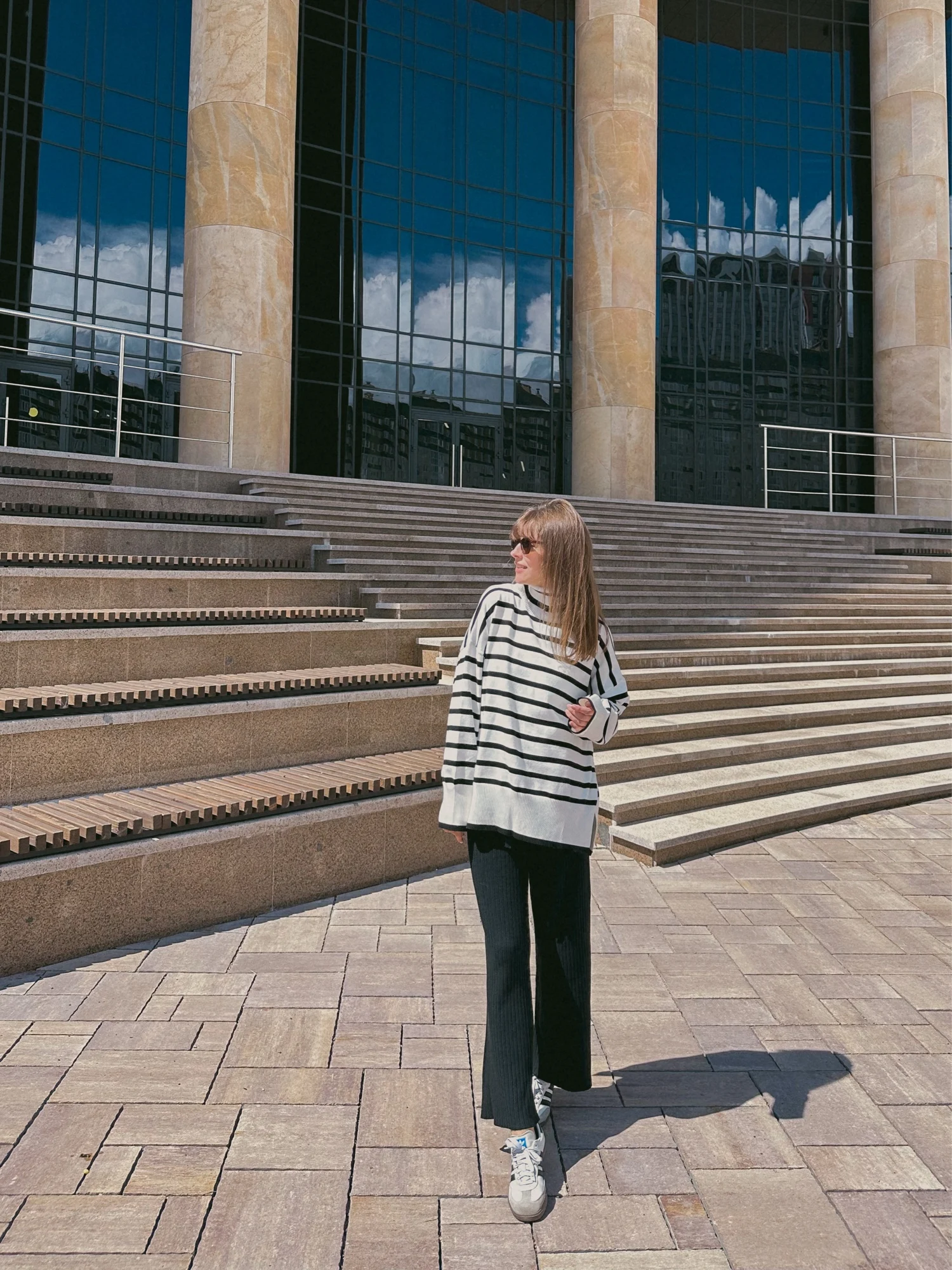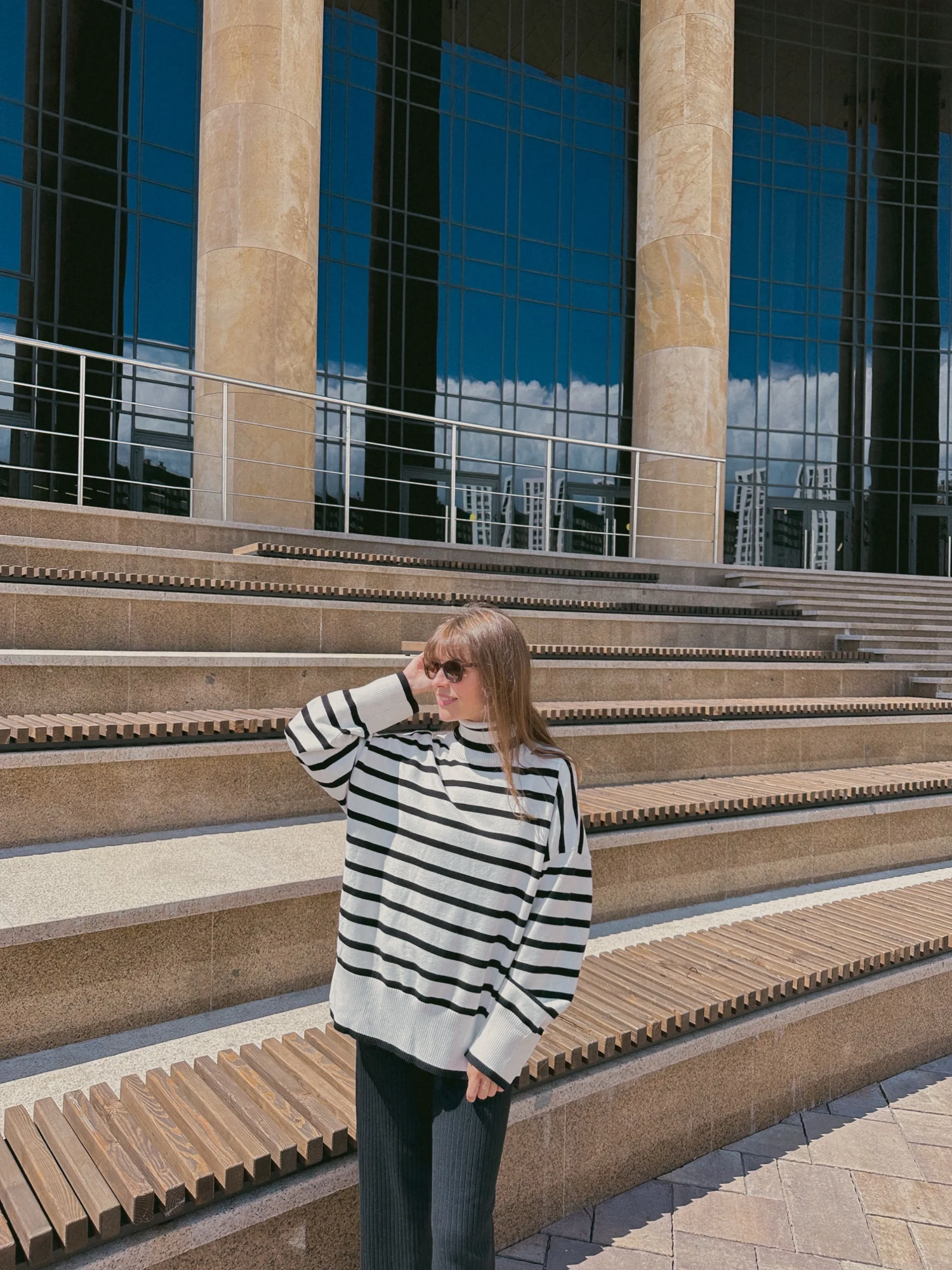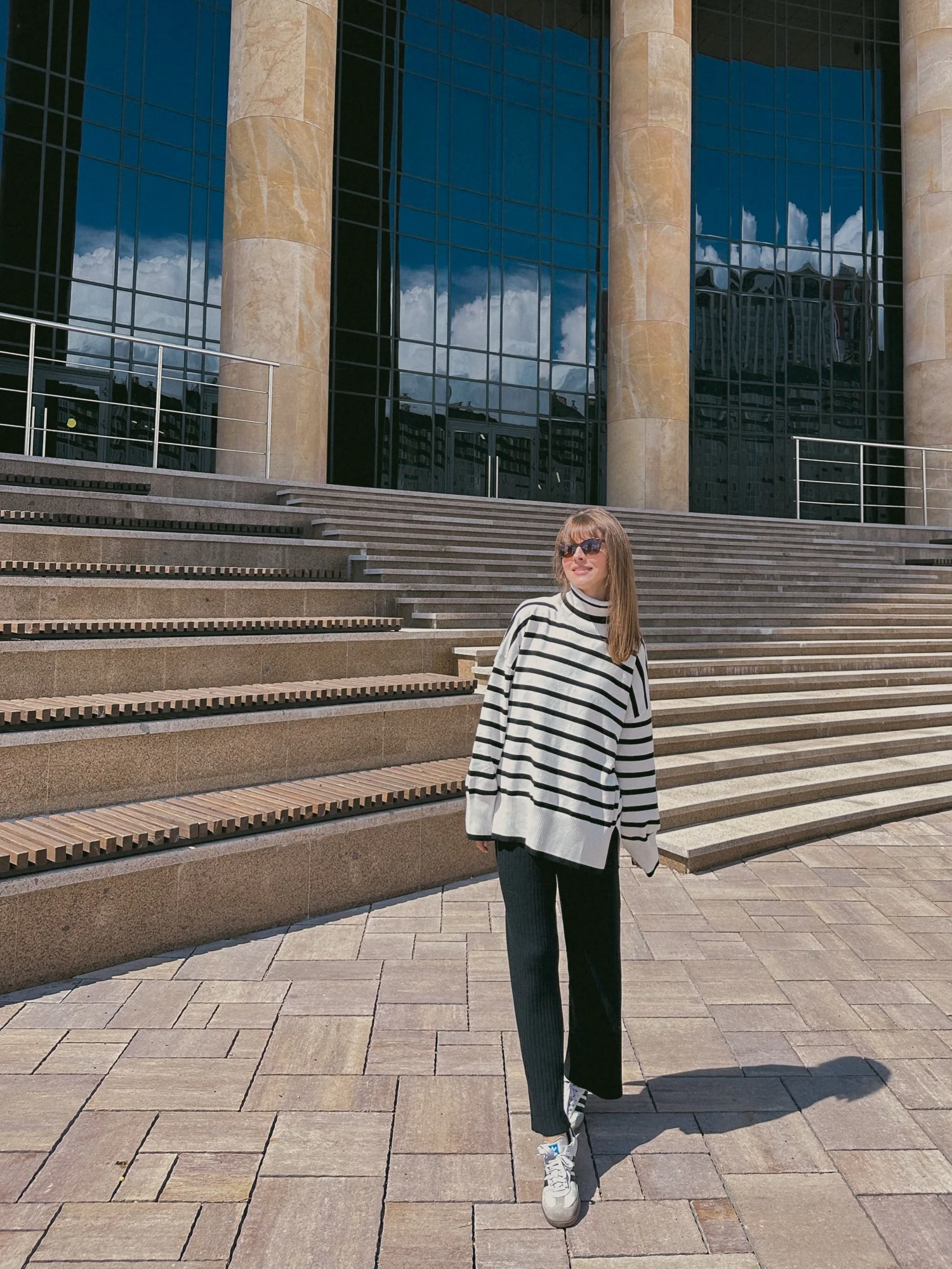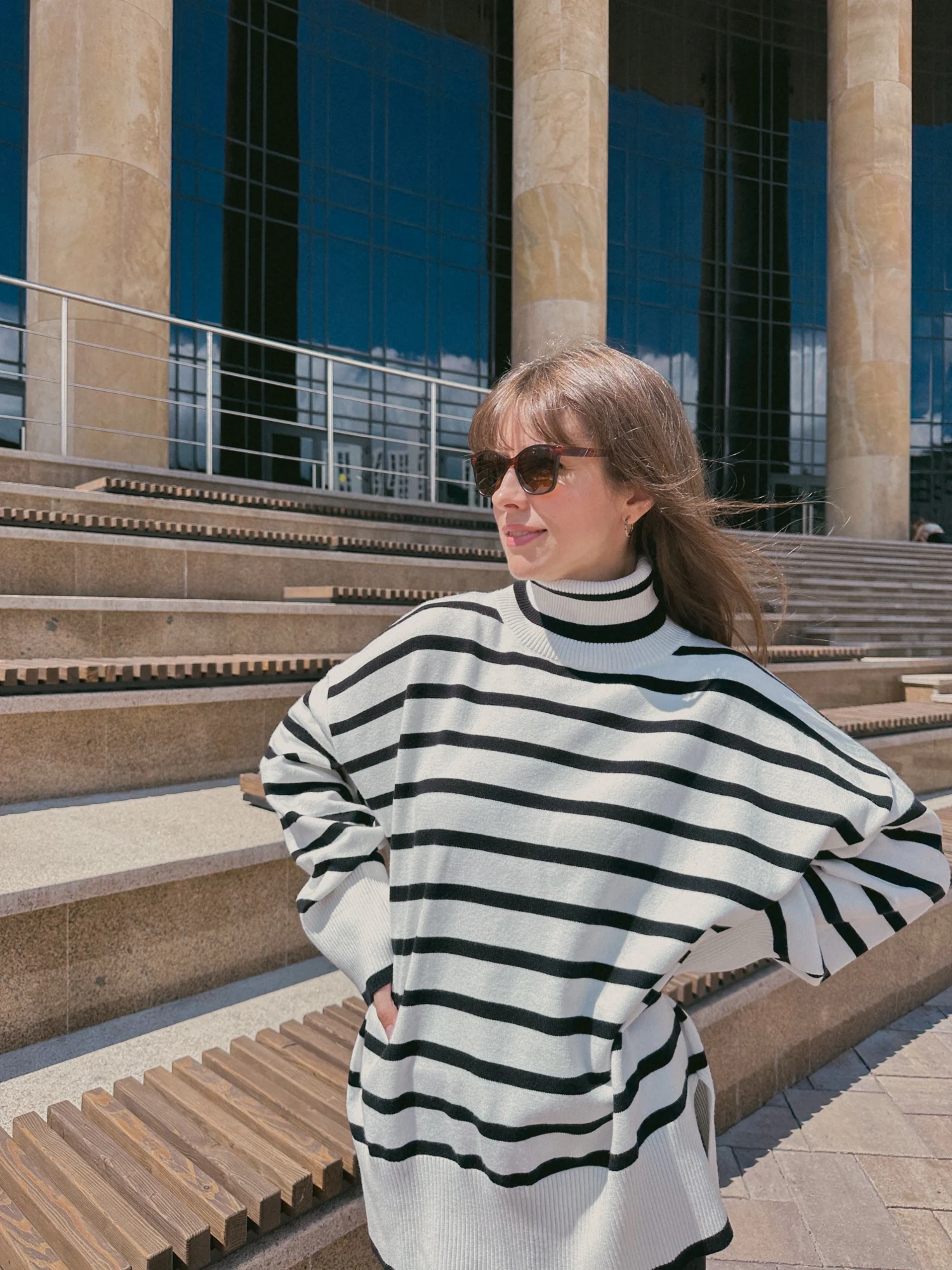 Stay warm and stylish with this oversized striped turtleneck jumper, perfect for casual high street outfits.