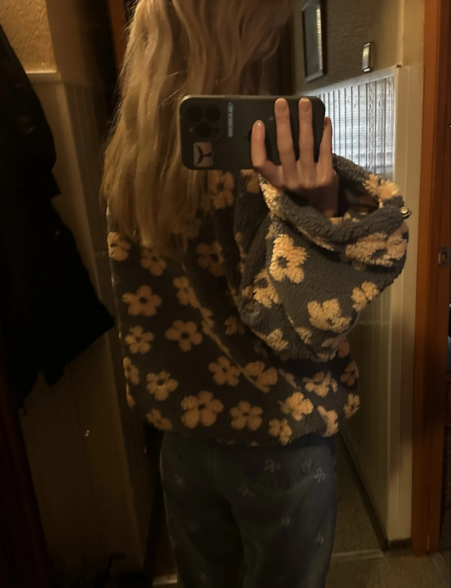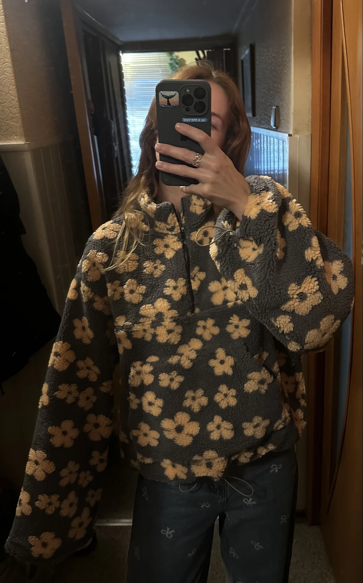 Cozy lamb wool printed sweater with zipper, loose fit, and raglan sleeves β€” an extra-heavy flannel pullover perfect for chilly spring and autumn days.