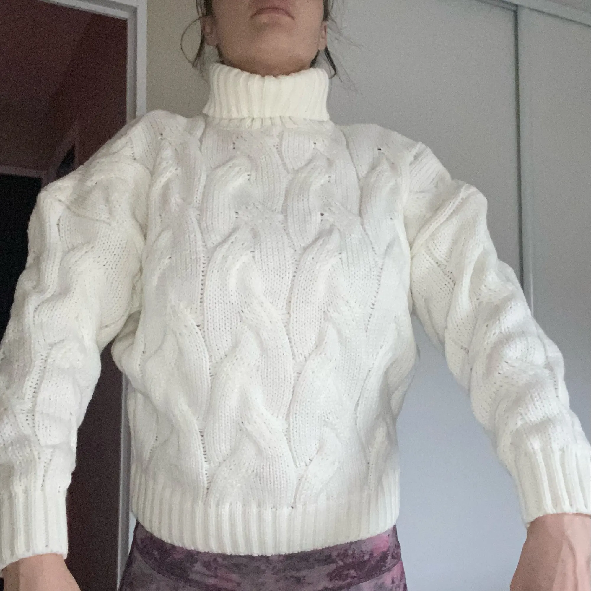 The yarn is soft. The pattern is beautiful. It is never clear where the back is in front and cut in the same way. Raglan sleeve. Rough sewn, not steamed, the seam is crooked. I will try to put it in order with a steam generator. The knitting is loose, transparent. What you see in the photo is the size XL on og 93, from 73. Raw threads are visible from the seams. The color is beautiful. It is not white, but slightly with a lemon tint, beautiful.