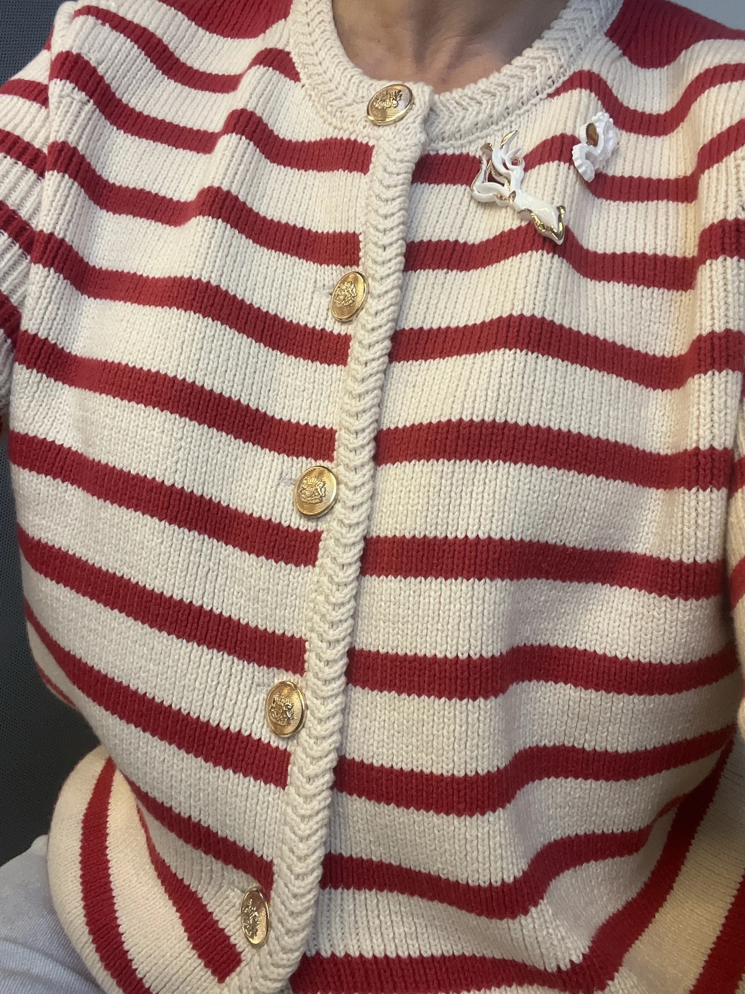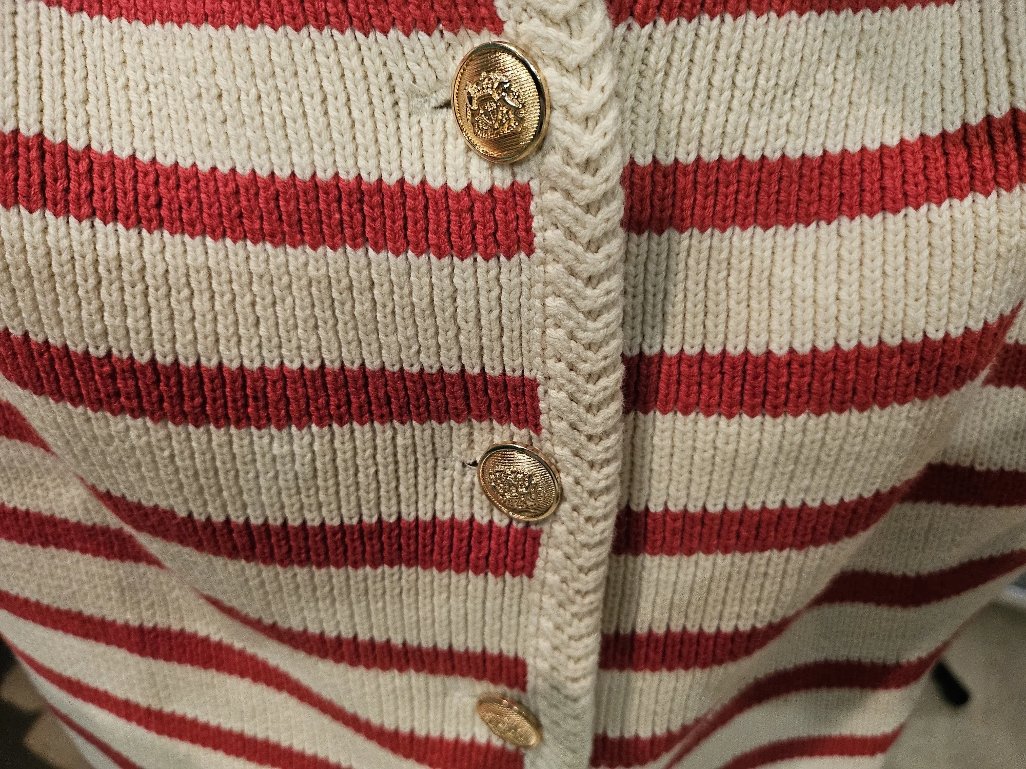 A striped cotton cardigan with a slim fit and classic button-up design—perfect for layering in office or casual autumn/winter looks.