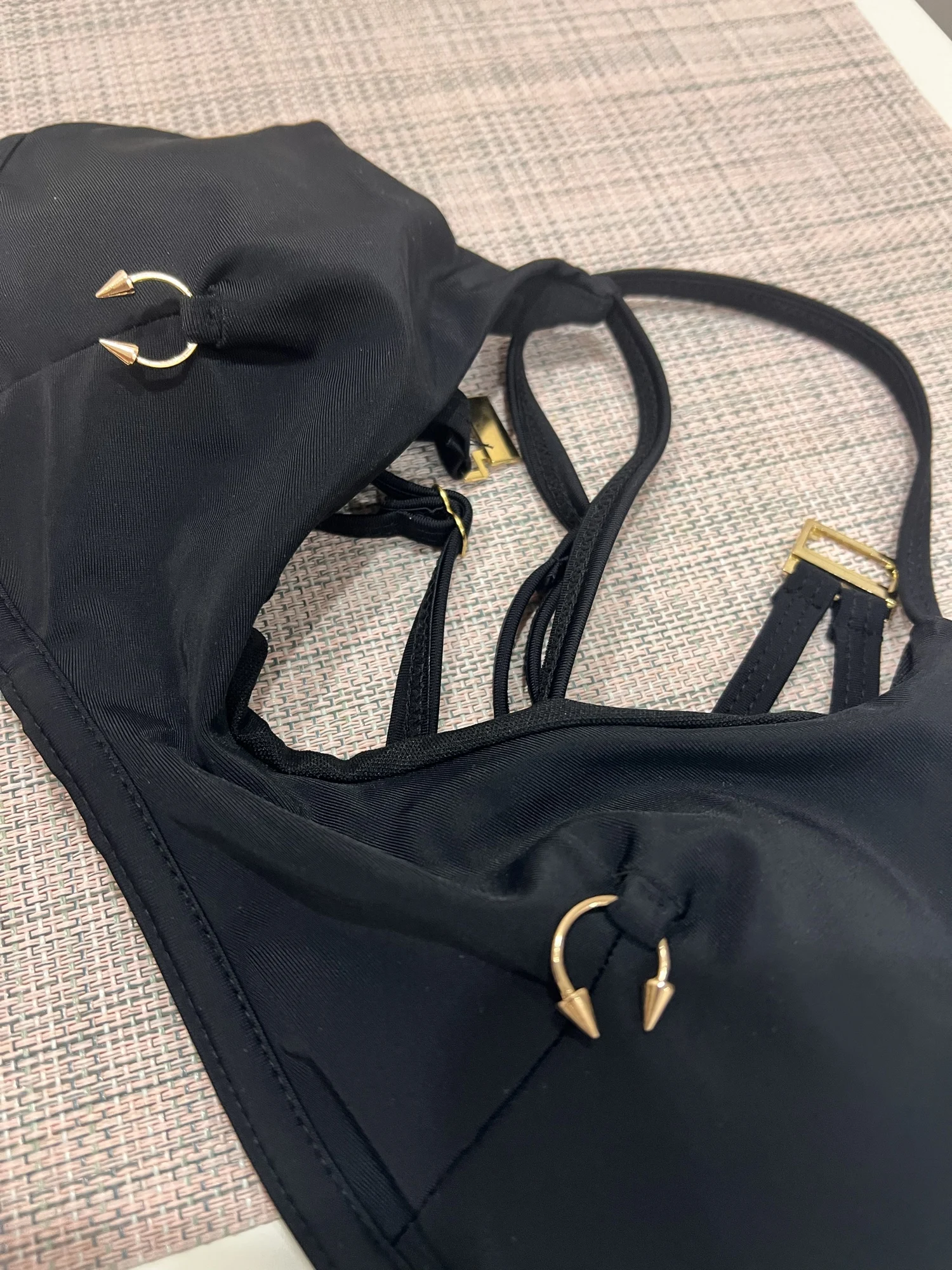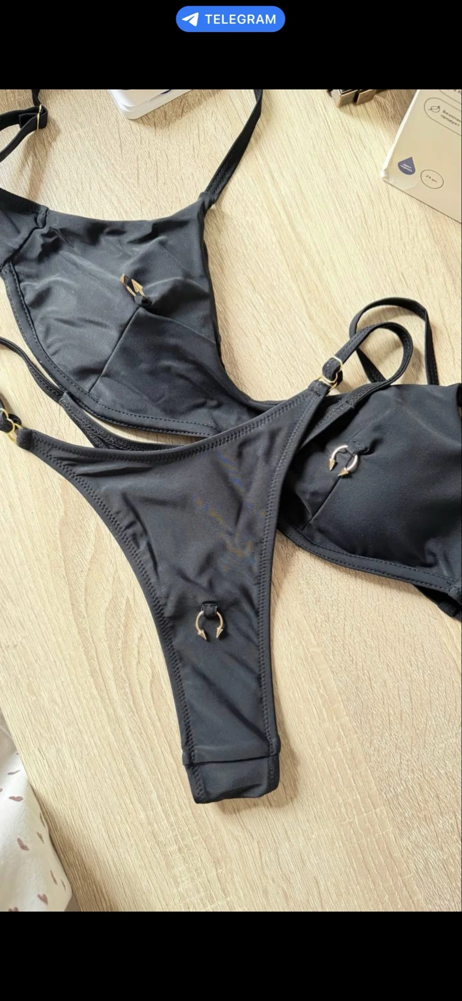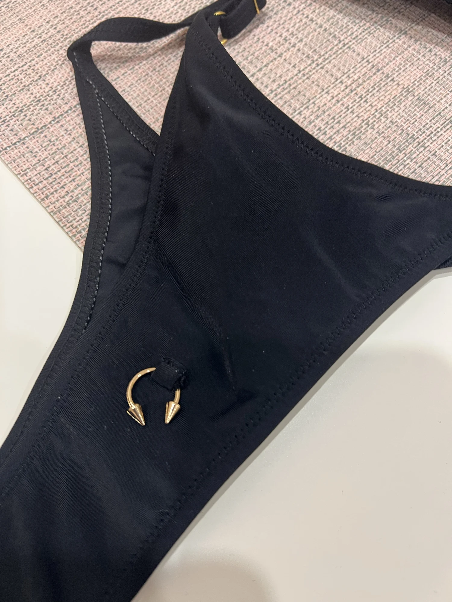 Sleek and minimal black bikini set designed with a high cut silhouette and adjustable straps. Features ring details and supportive underwire structure for a flattering and confident summer look.