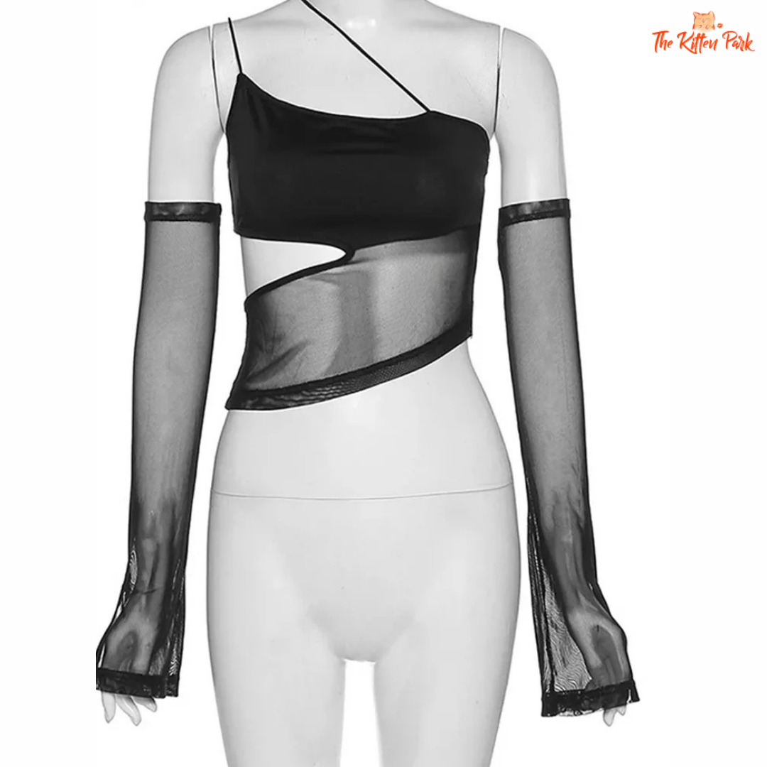 Asymmetrical Mesh Crop Top – Cut-Out Fairy Grunge Tank with Sleeves for Women