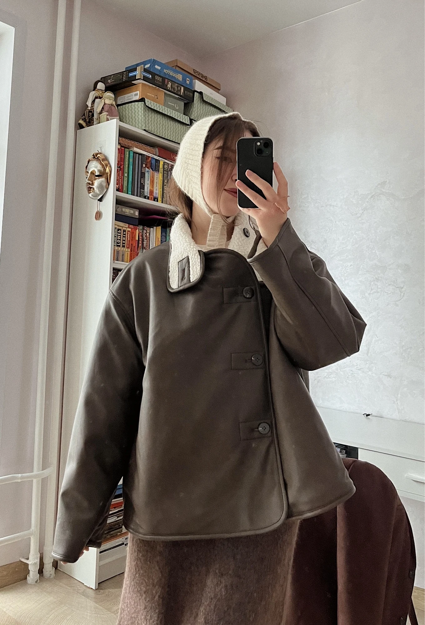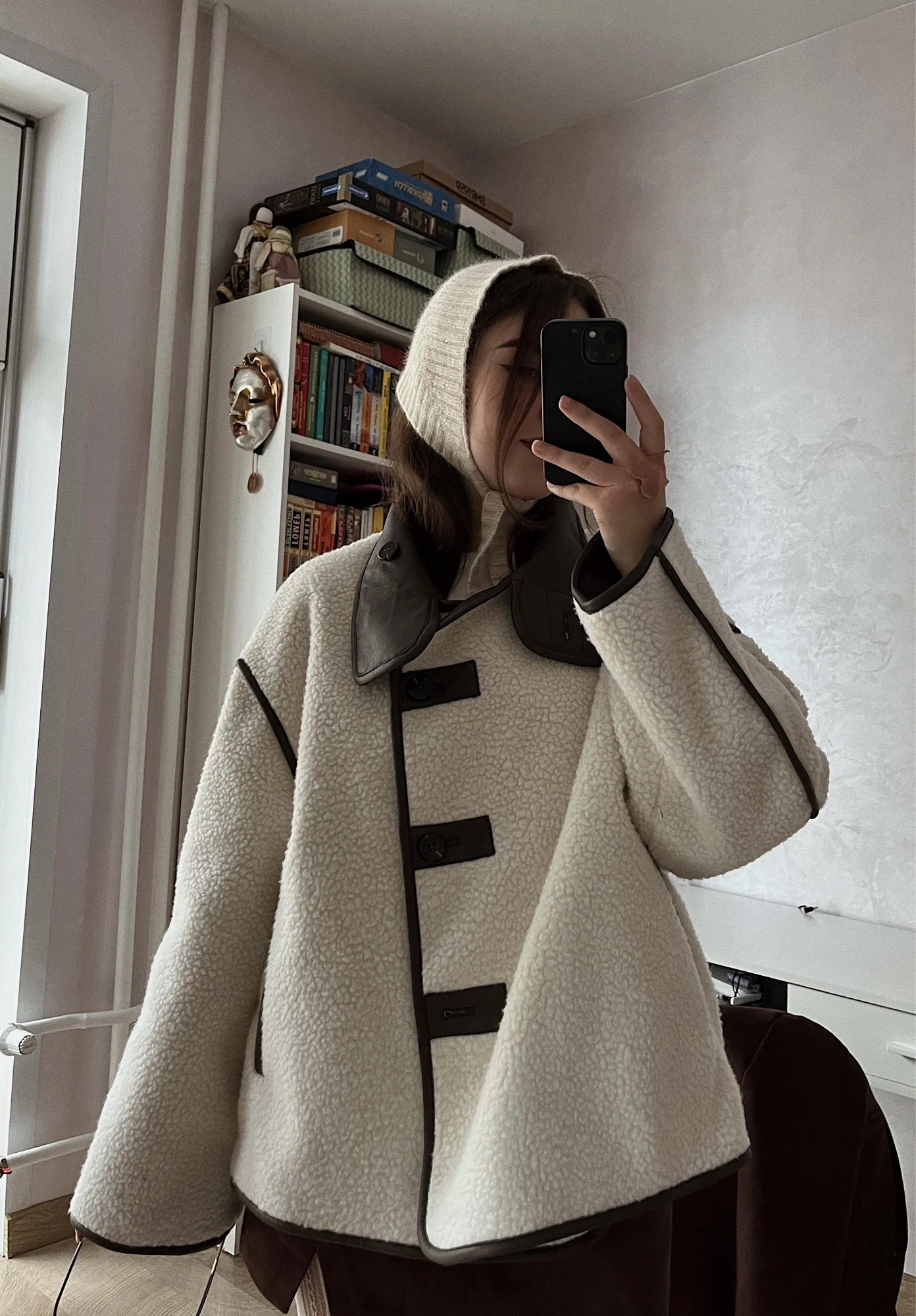Cozy reversible faux lamb fur jacket with chic patchwork design, offering warmth and streetwear style for autumn and winter.