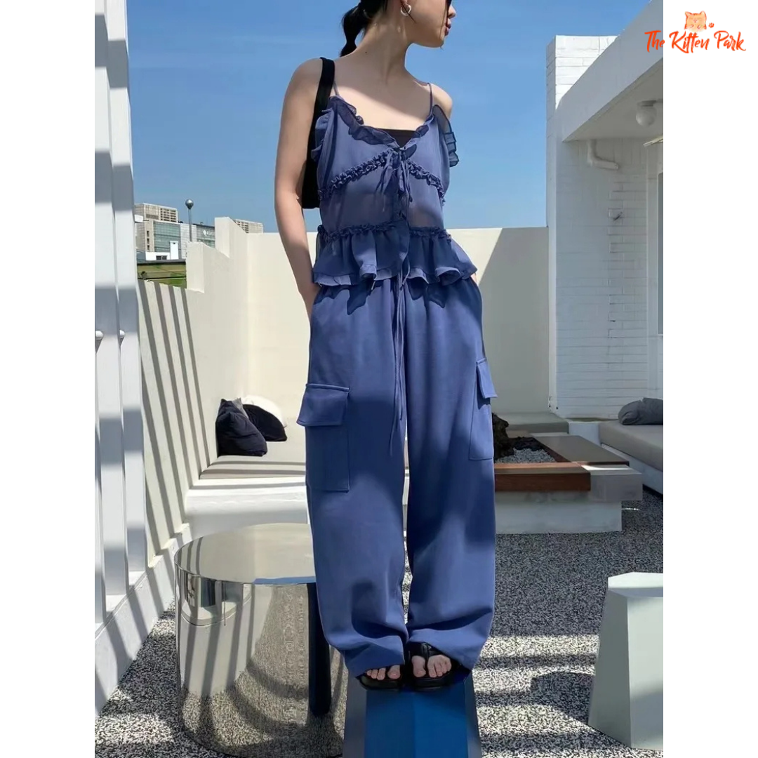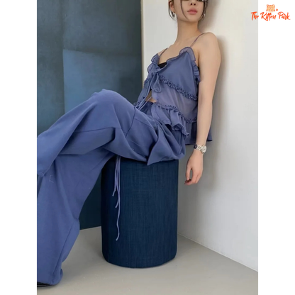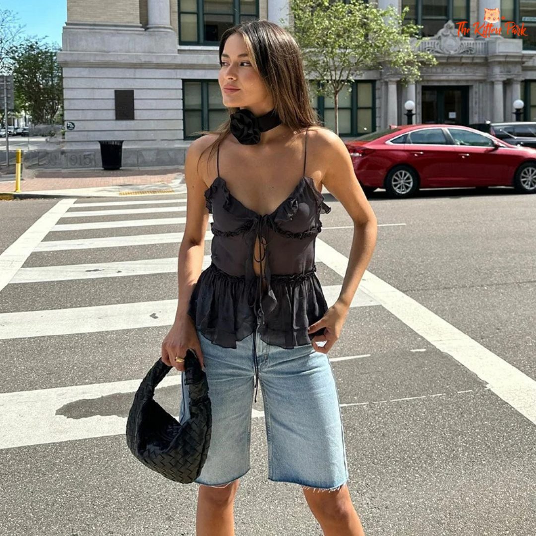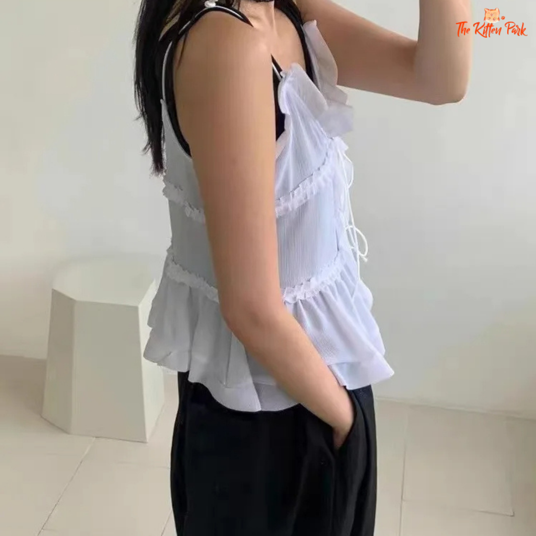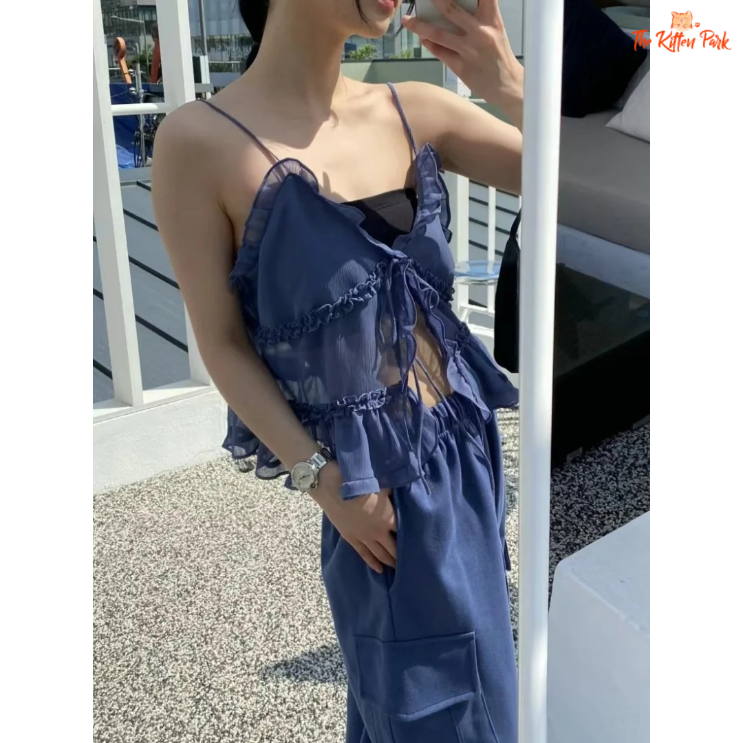 Sheer Chiffon Tie Cami β Y2K Festival Backless Frill Hem Crop Top